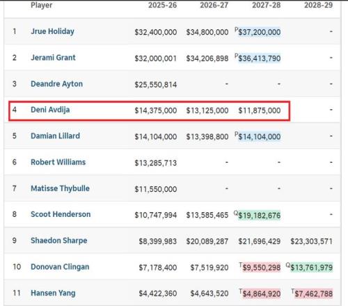 阿夫迪亞如今還是聯盟物美價廉的代表之一,他的合同還剩3年——2025-26賽季年薪1438萬美元,2026-27賽季1313萬美元,2027-28賽季1188萬美元。當今聯盟全明星級別球員的年薪大都是3000萬美元以上。
