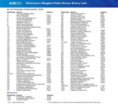 北京時間12月9日,澳大利亞網球公開賽官方公布2026澳網男、女單正賽入圍名單。中國選手共有7人入圍單打,女單4人,男單3人。本屆賽事,愛奇藝體育將全程直播。