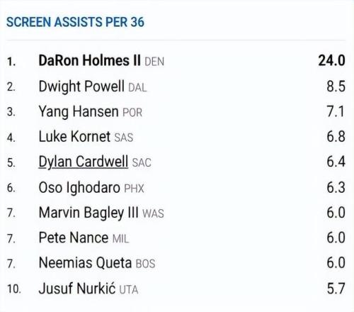 除此之外,根據(jù)NBA官方最新公布的數(shù)據(jù),楊瀚森本賽季每36分鐘掩護助攻7.1次,高居聯(lián)盟第三。這個數(shù)據(jù)無疑是非常出色的,也代表著楊瀚森無球掩護的價值相當(dāng)高。雖然這個數(shù)據(jù)并不會記錄在數(shù)據(jù)欄上,但實際上他背后彰顯的是這位球員的球商以及對球隊的潛在貢獻。
