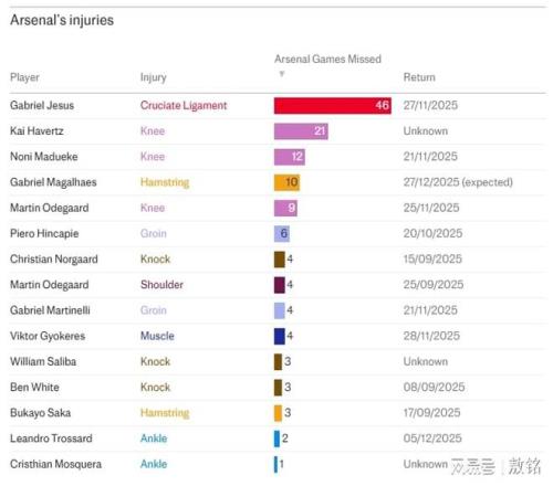 12月13日消息,本賽季阿森納25人一線隊陣容里,先后17名球員受傷,受傷的人數僅僅比利茲聯少,排第二。